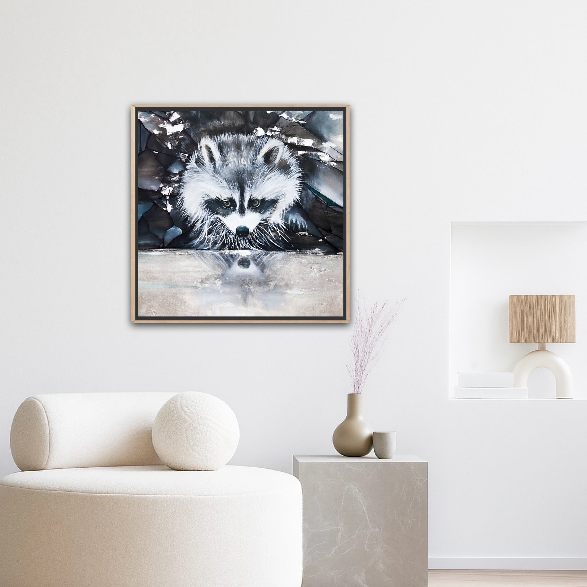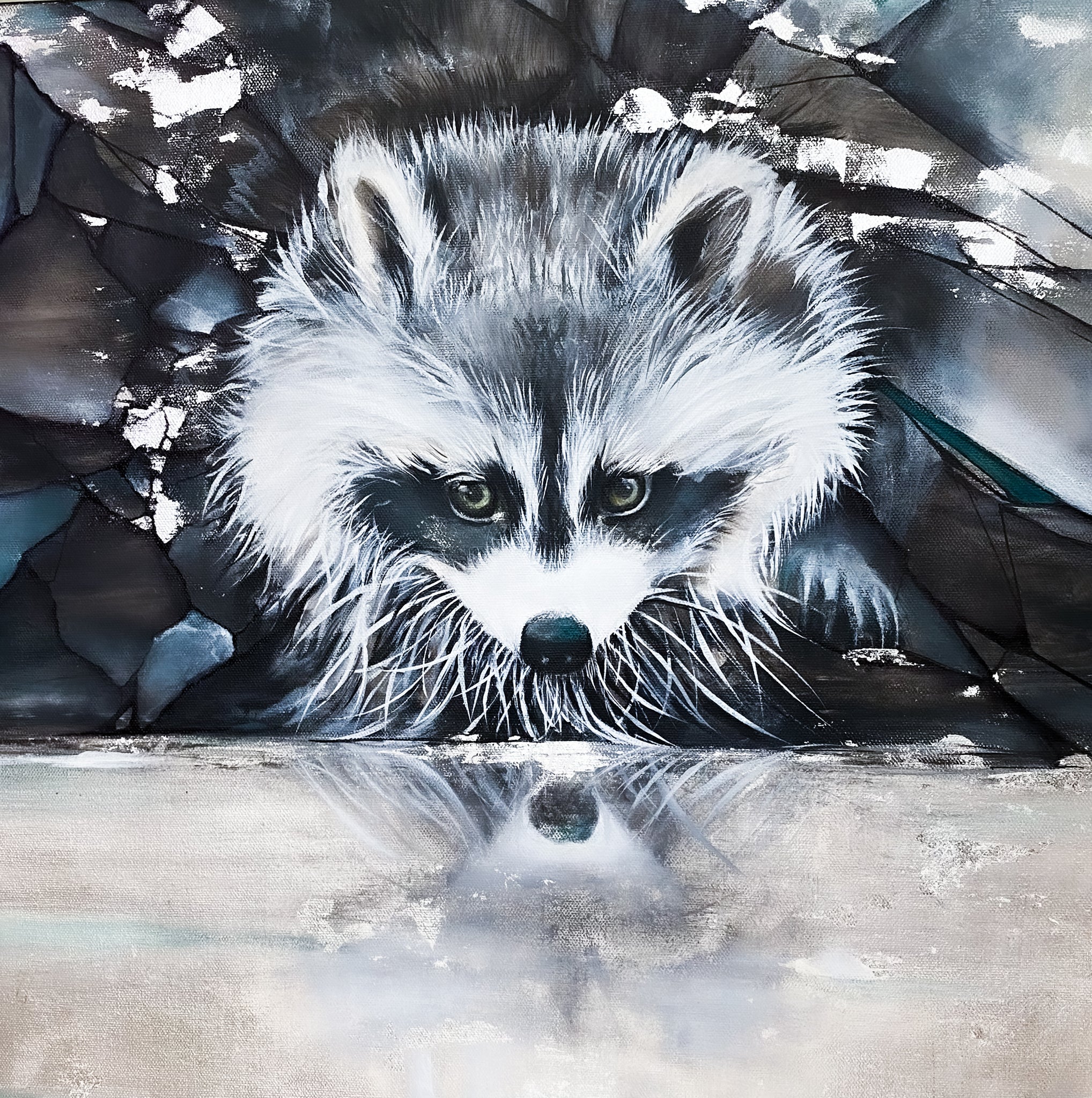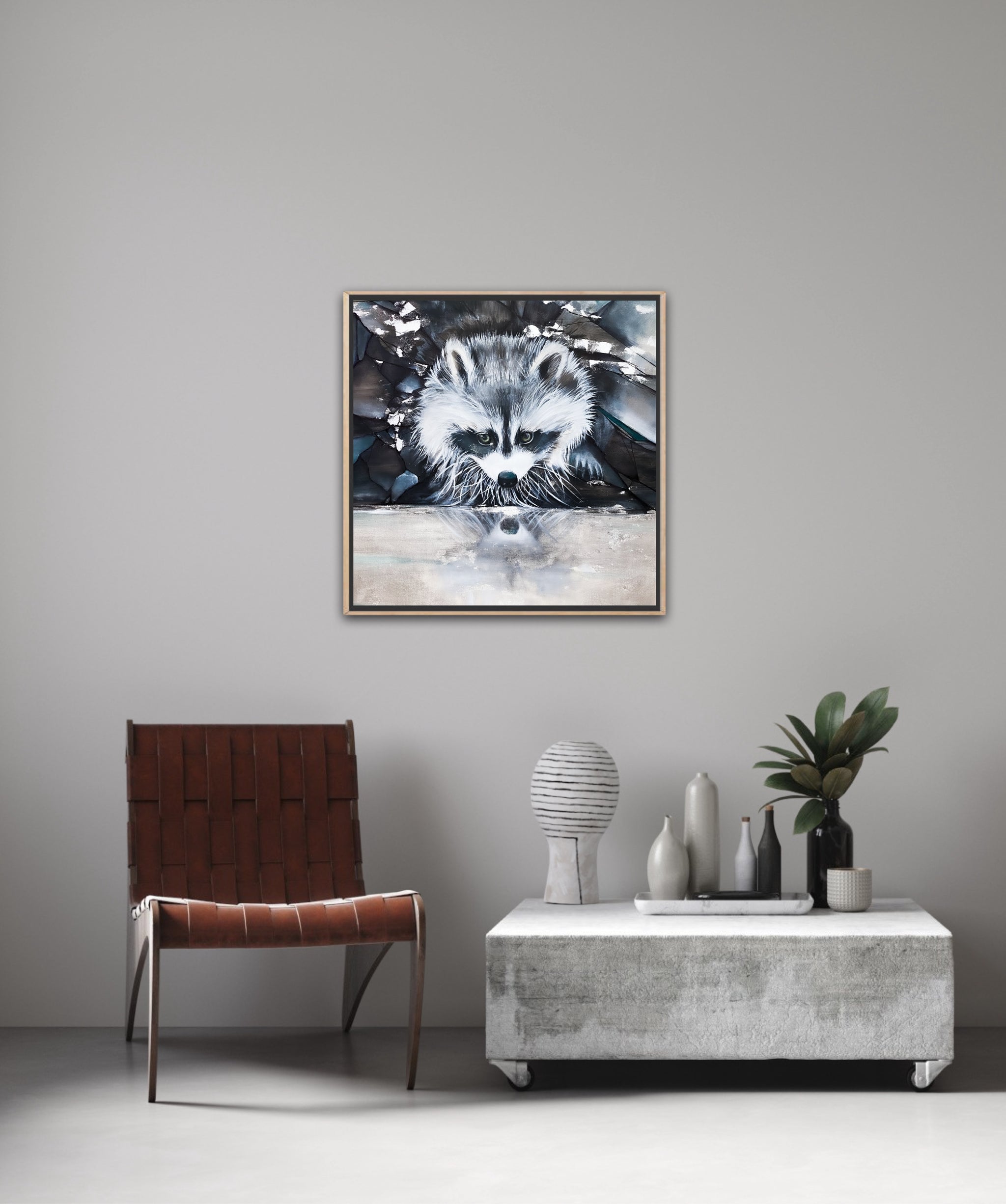 Découvrez cette œuvre fascinante et très contemporaine représentant un raton laveur, habilement mis en valeur par une touche de feuille d'argent authentique. Avec son regard malicieux et son pelage texturé, cette pièce est une célébration de la nature et de la beauté sauvage.