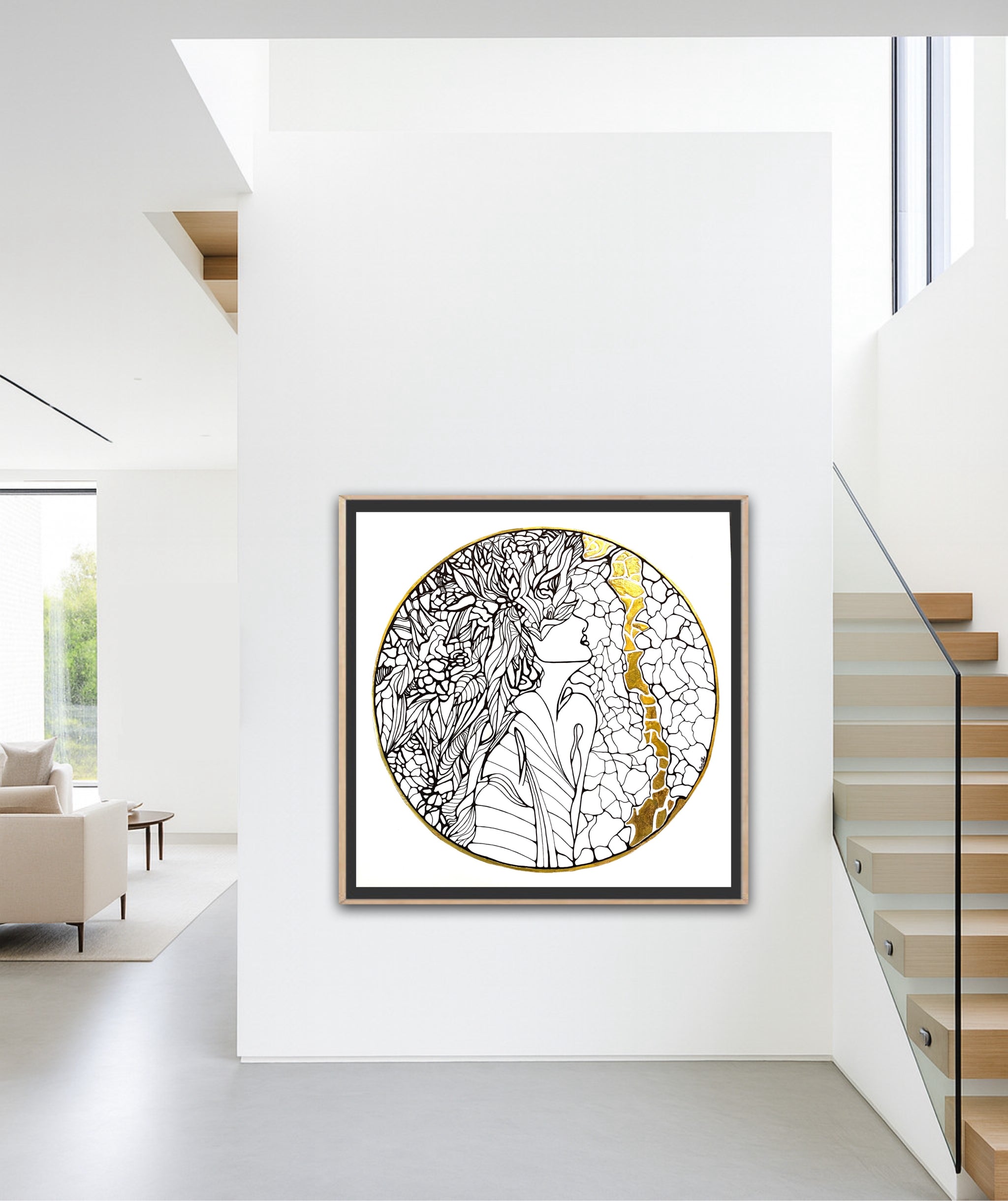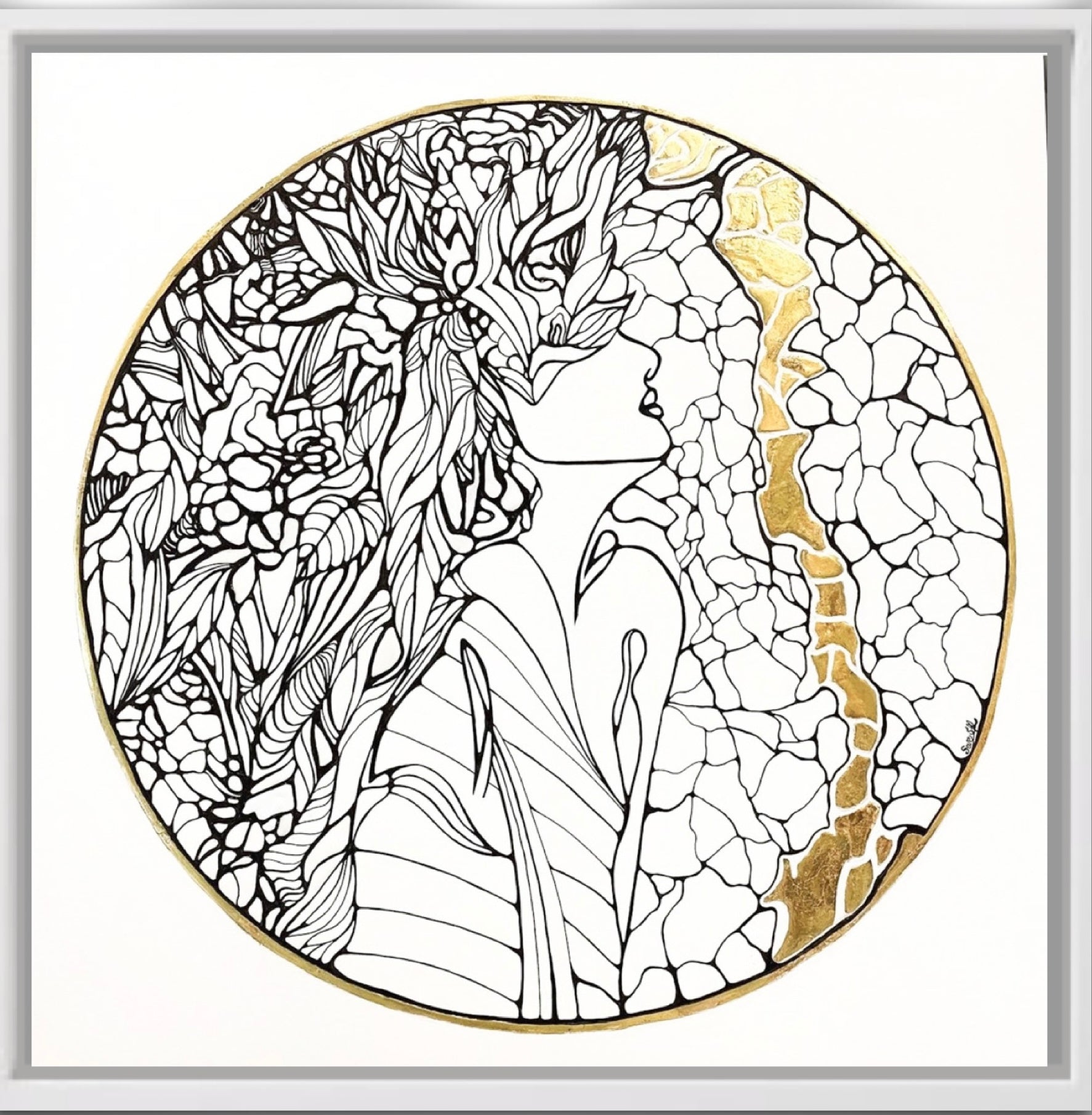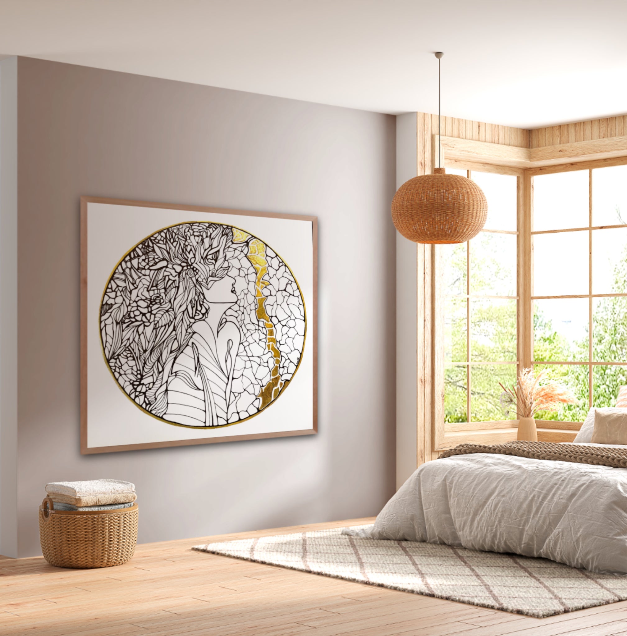 Plongez dans l’univers captivant de l'œuvre de Seve_Fh, où une femme au style graphique épuré incarne la beauté intemporelle et la résilience. Inspirée par l'art déco et l’Asie, elle est entourée de motifs floraux délicats qui dansent autour d’elle. Les fragments texturés d'or, intégrés tels des bijoux illuminent la toile, ajoutant une touche de raffinement et de cheminement intérieur.