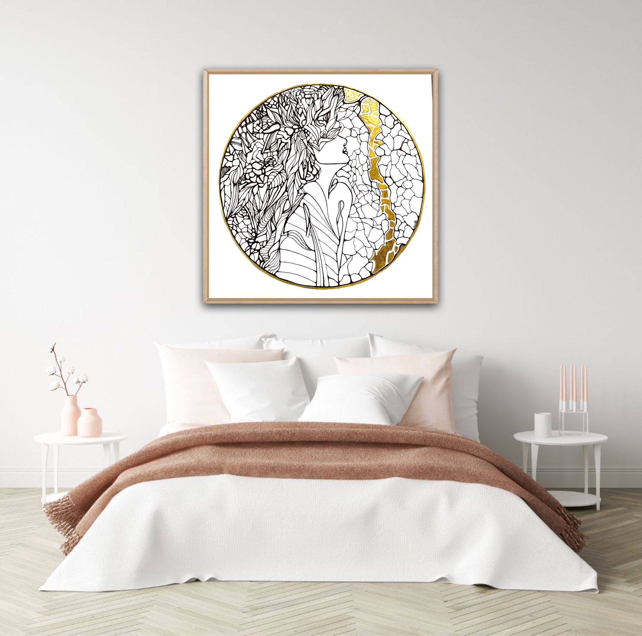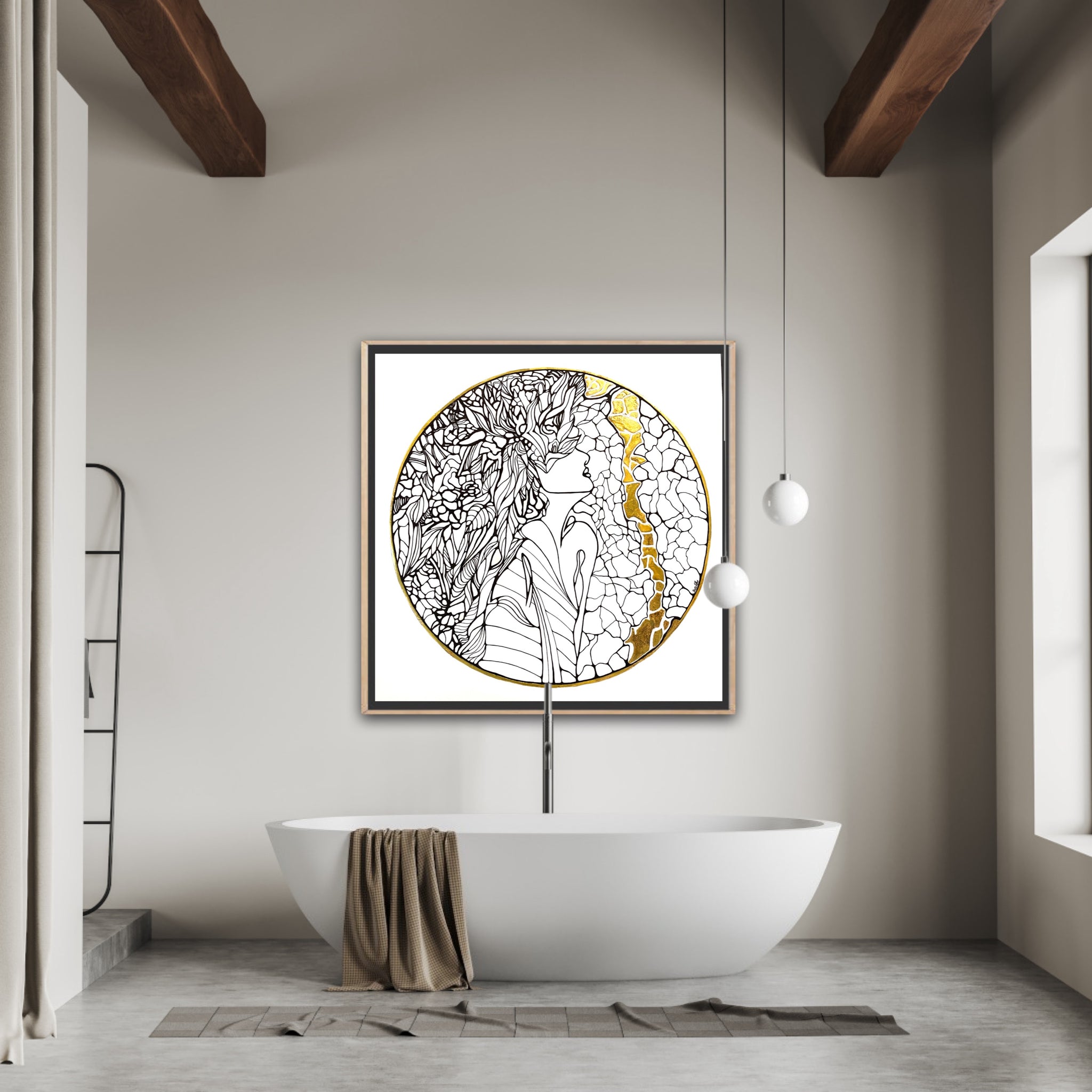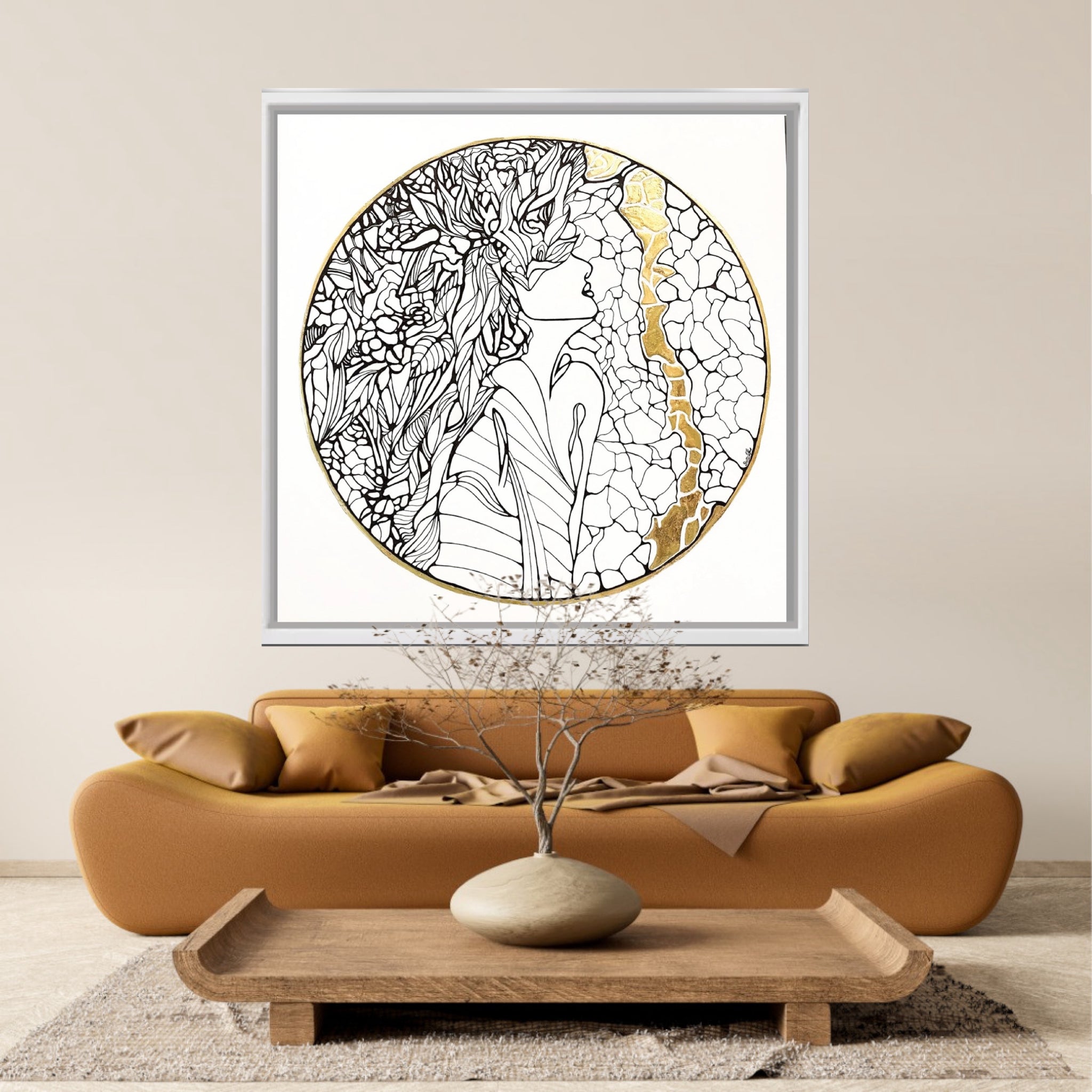 Plongez dans l’univers captivant de l'œuvre de Seve_Fh, où une femme au style graphique épuré incarne la beauté intemporelle et la résilience. Inspirée par l'art déco et l’Asie, elle est entourée de motifs floraux délicats qui dansent autour d’elle. Les fragments texturés d'or, intégrés tels des bijoux illuminent la toile, ajoutant une touche de raffinement et de cheminement intérieur.