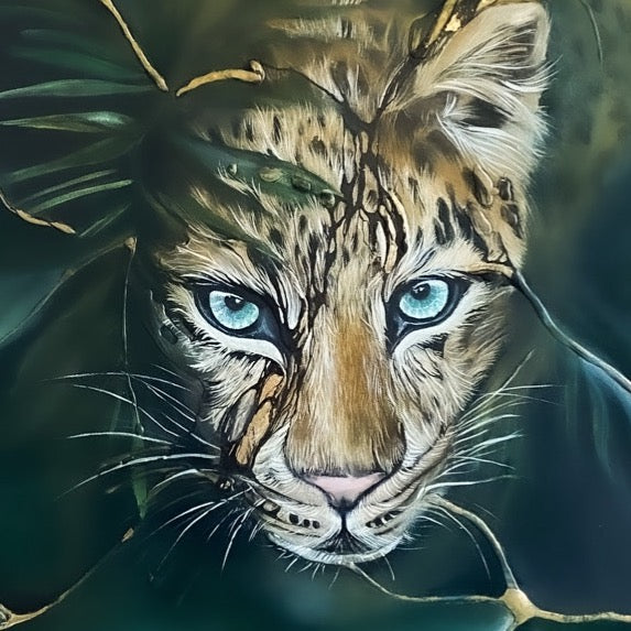 Dans cette œuvre poignante, Chilka se dresse, ornée de fissures d'or qui serpentent le long de son pelage. Ces lignes brillantes ne sont pas simplement esthétiques ; elles symbolisent sa résilience inébranlable face à l'effacement de sa race.